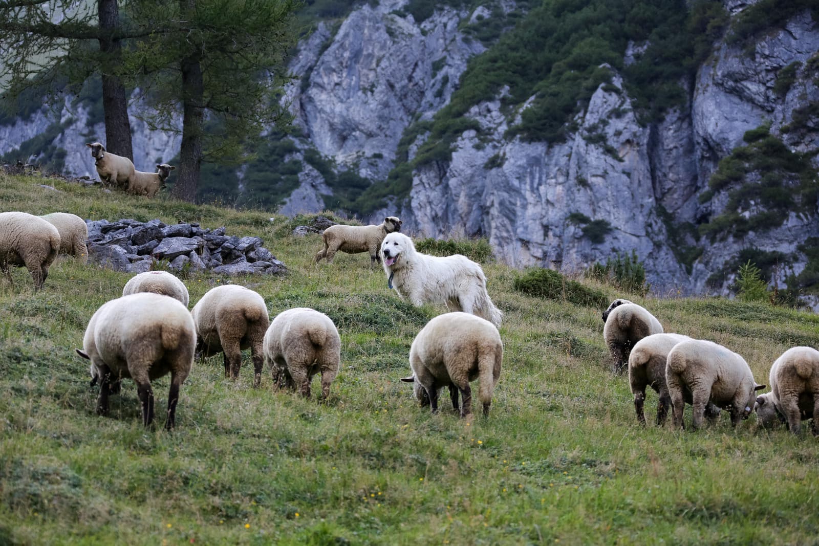 Beginning in 2013, the Alp has been protected by sheep guard dogs. The shepherds use their own border collies to assist them in their daily chores of moving and herding the sheep, plus an additional six guard dogs to protect the herd. The guarding dogs are specially trained and socialised Pyrenees Patou (Pyrenean mountain dog) or Italian Maremma Sheepdogs. Some of these dogs are owned by sheep owners others were provided by a guard dog breeder. There is a mix of older experienced in combination with younger dogs.